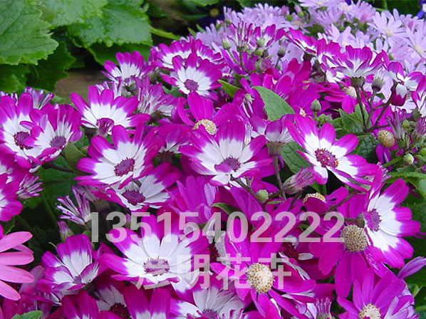 别称富贵菊、黄瓜花。多年生草本,常作1-2年生栽培。分为高生种和矮生种,20-90厘米不等。全株被微毛,叶片大形如瓜叶,绿色光亮。花顶生,头状花序多数聚合成伞房花序,花序密集覆盖于枝顶,常呈锅底形,花色丰富,除黄色其他颜色均有,还有红白相间的复色,花期1-4月。瓜叶菊的花语是:喜悦,快活,快乐,合家欢喜,繁荣昌盛。适宜在春节期间送给亲友,此花色彩鲜艳,体现美好的心意。